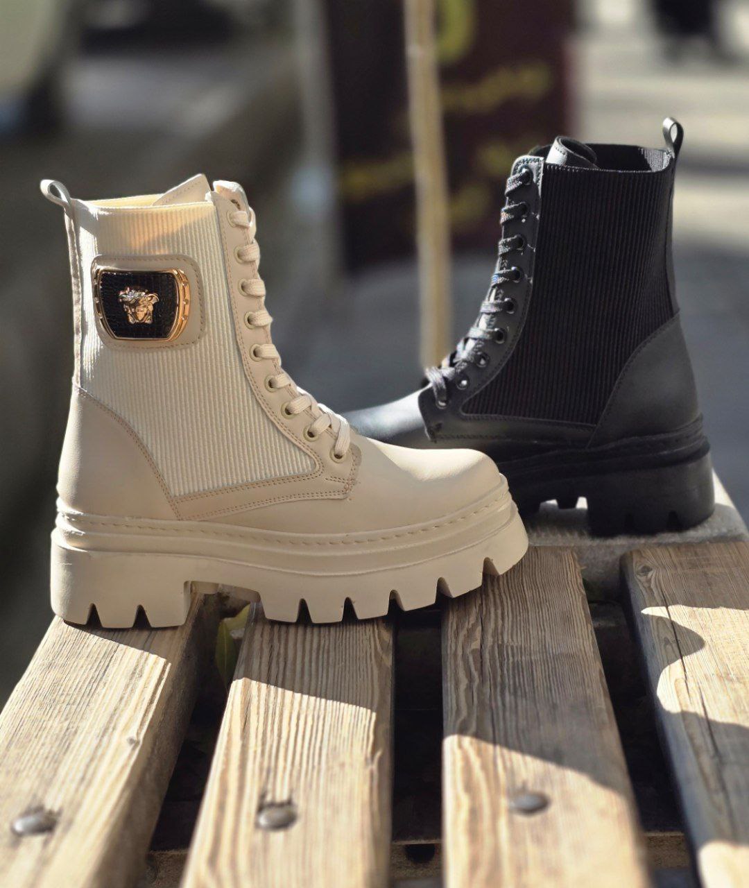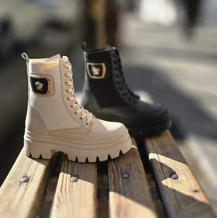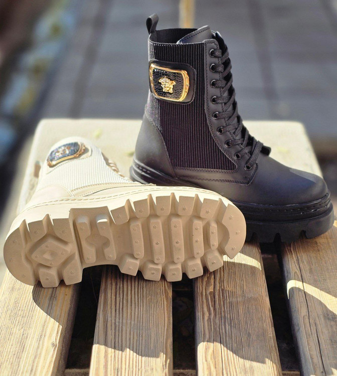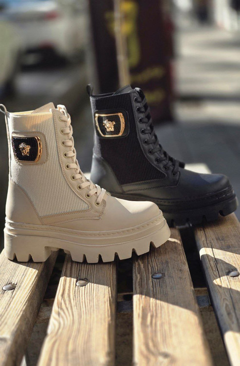 پوتین ورساچ بندی با ساق کشی دو رنگ مشکی و کرم _دور دوخت