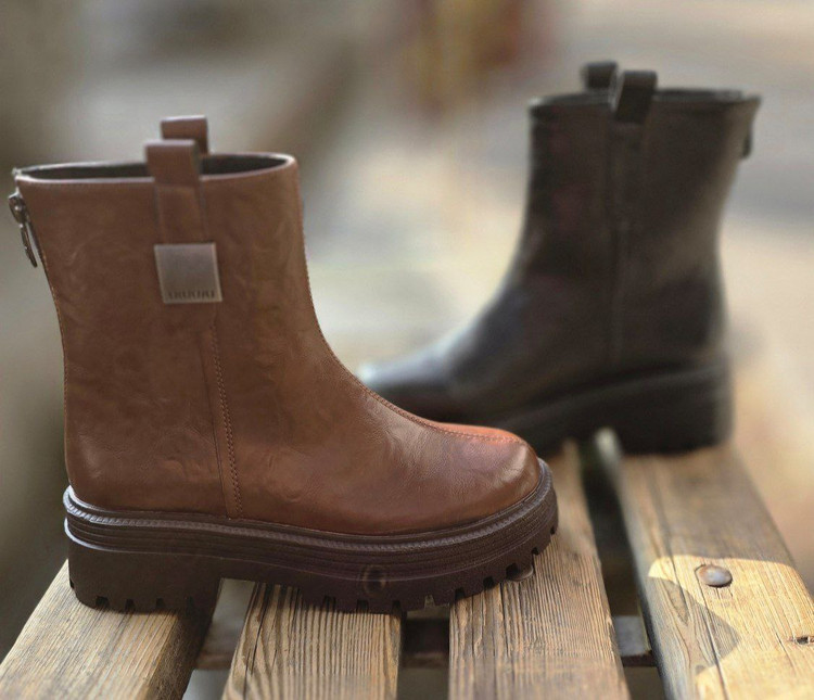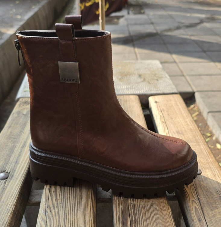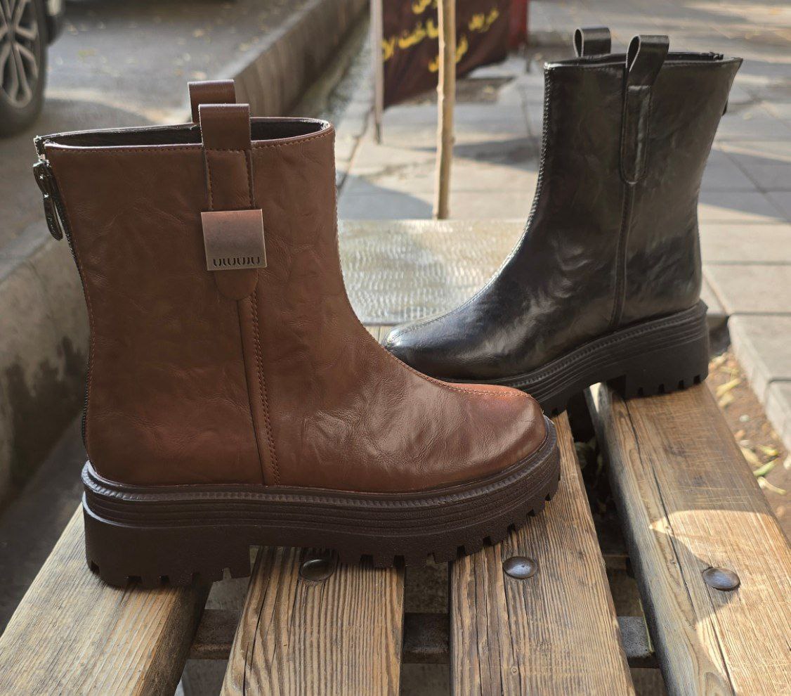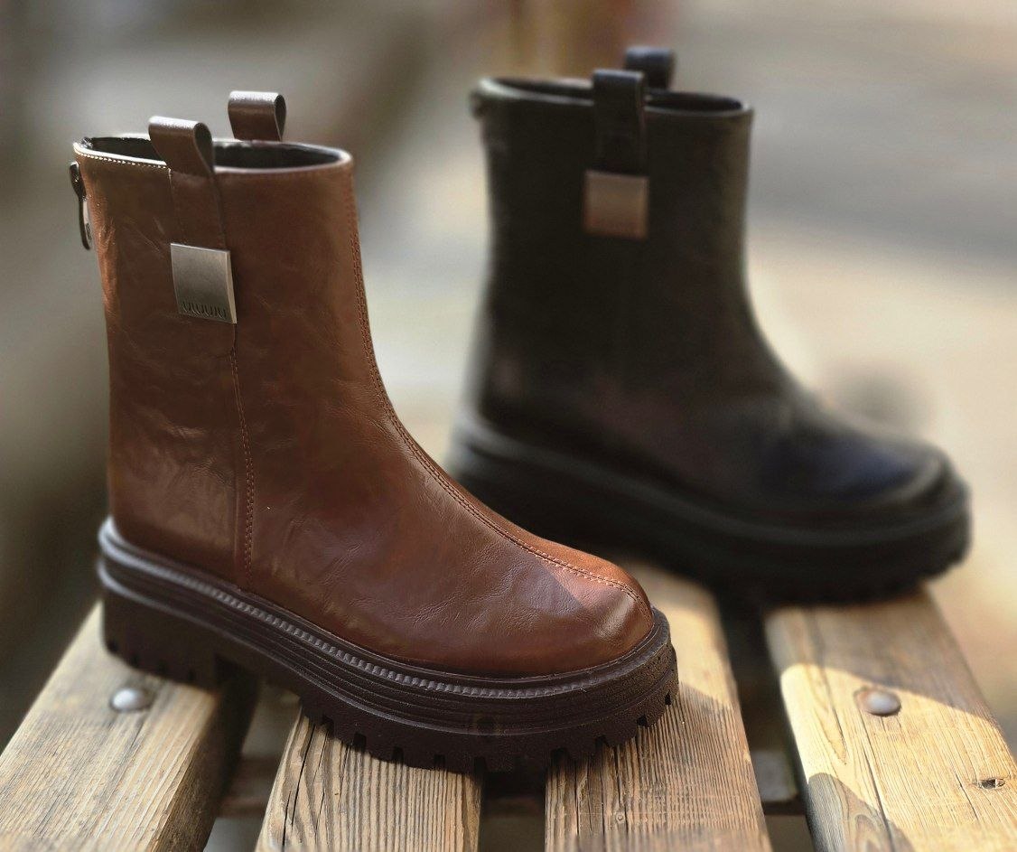 این بوت چلسی زنانه با رویهٔ چرمنمای قهوهای و پلاک فلزی مربعی روی بند پشتی، انتخابی متفاوت برای روزهای سرد است. پنل کشی مشکی در کنار لوپ بالای ساق، پوشیدن را بیدردسر میکند و زیرهٔ عاجدار عمیق مسیرهای بارانی را بیخطر میسازد. رنگ قهوهای گرم بهسادگی با جین آبی، شلوار کرم یا پالتوی شتری ست میشود—همراهی سبک و مطمئن برای پاییز و زمستان.