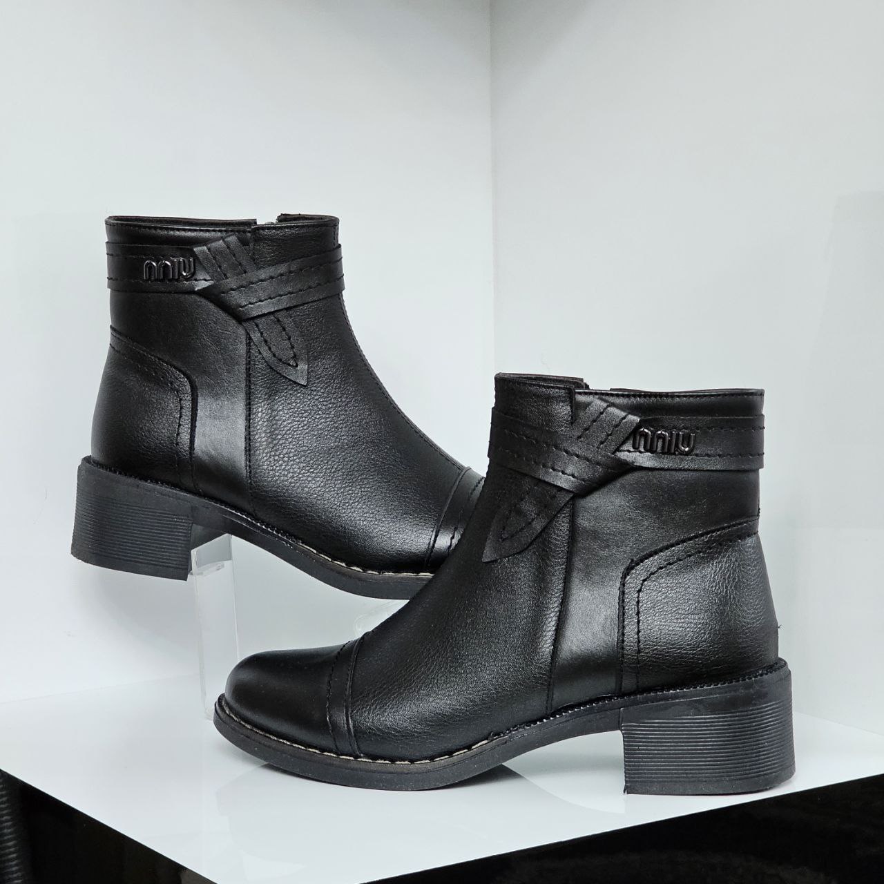نیمبوت زنانه با رویهٔ چرمنمای مشکی و بند تزیینی روی ساق که با نام «miu» مزین شده، استایل روزمرهٔ شما را به سطحی شیک و منظم میرساند. پنل دوختدار دور قوزک، جلوهای متفاوت به طراحی مینیمال میدهد و پاشنهٔ بلوکی کوتاه، تعادل و راحتی را برای قدمهای طولانی فراهم میکند. درزهای تمیز، نوک گرد و لوپ پشت ساق، پوشیدن را آسان کرده و آن را همراه خوبی برای جین جذب، لگ یا حتی کت پشمی در هوای خنک میسازد.
